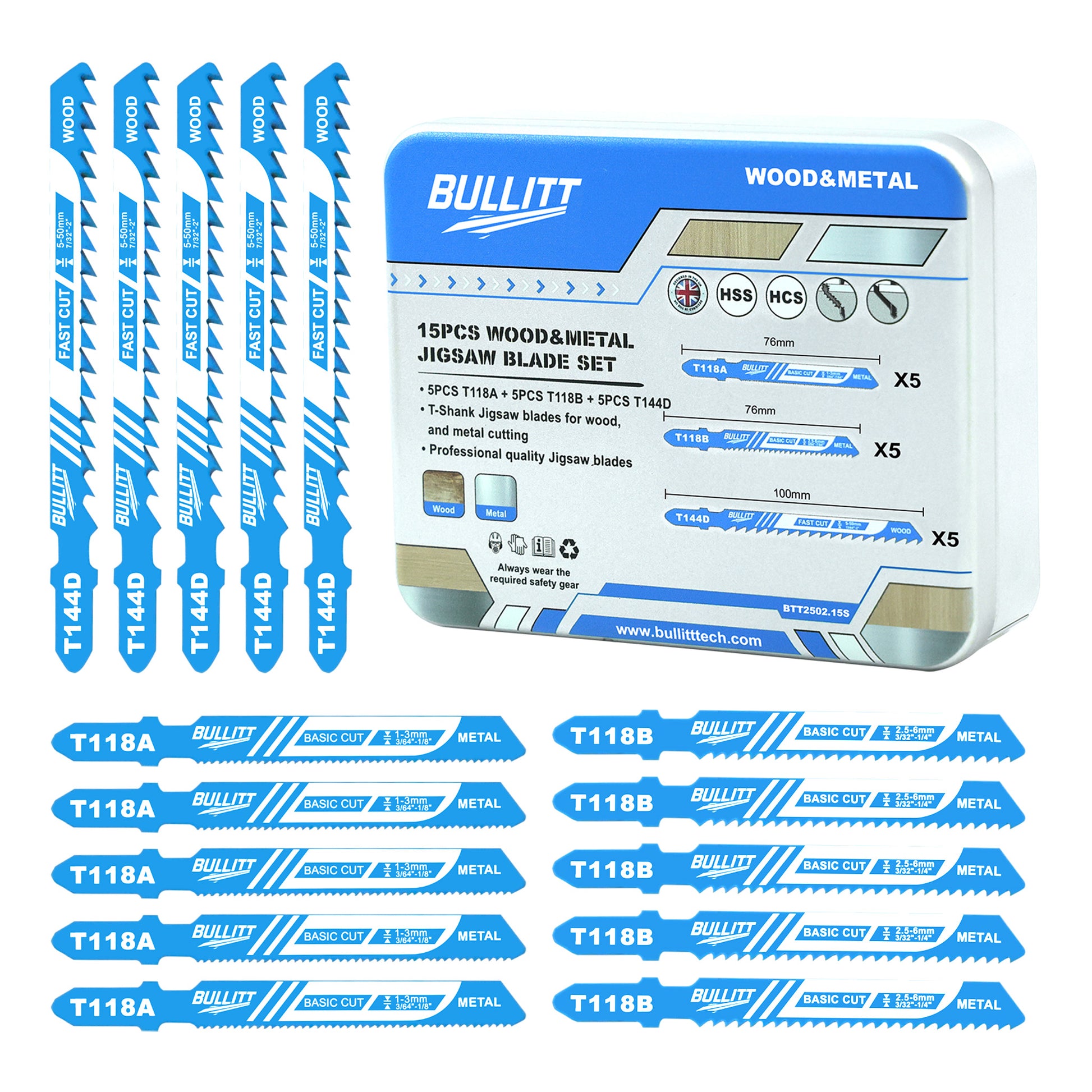 15-Piece Mixed Jigsaw Blade Set - Wood & Metal Cutting (5×T144D + 5×T118A + 5×T118B)