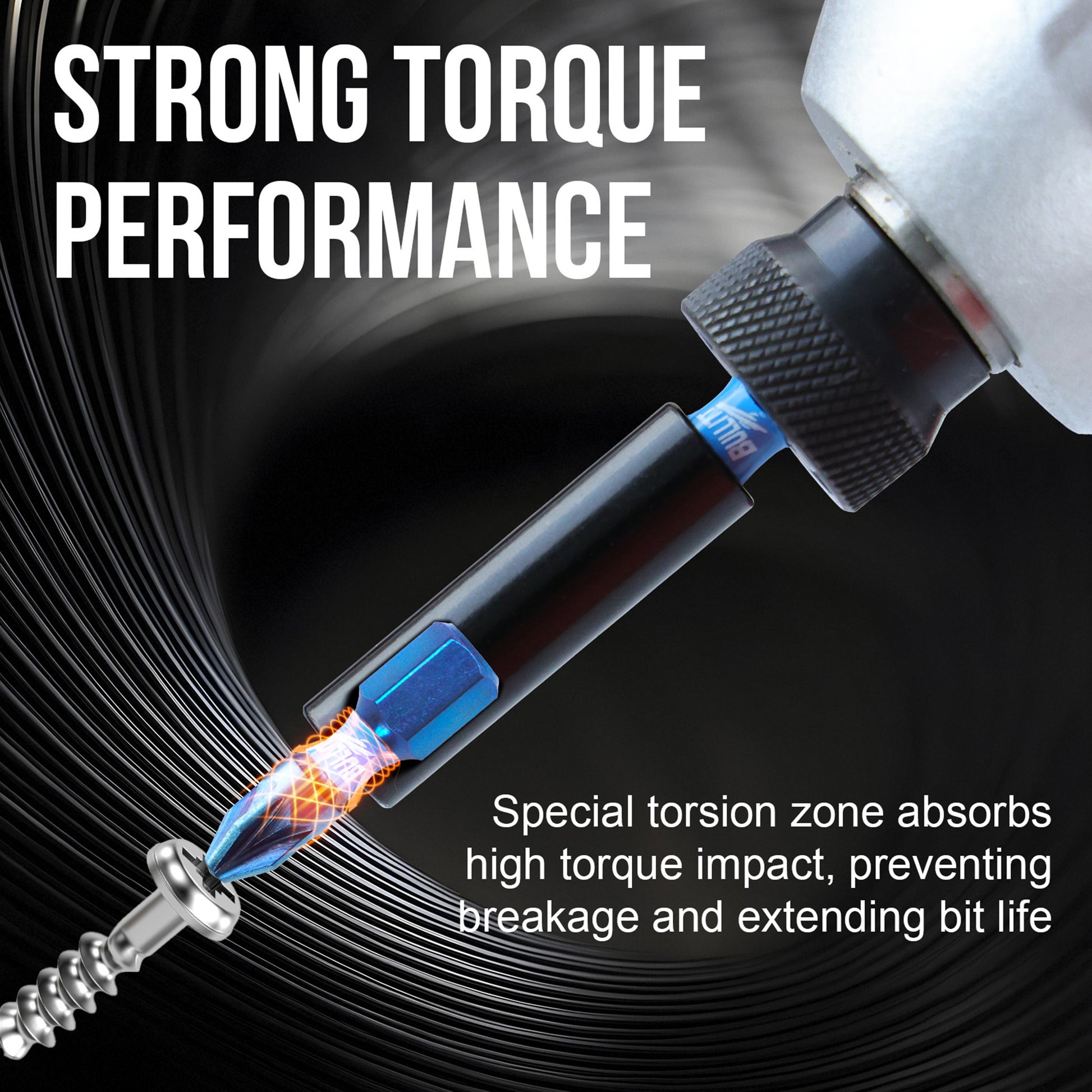 Industrial-grade S2 steel bits with blue titanium coating and magnetic tips, complete with strong magnetic bit holder. The most commonly used PoziDriv size for professional and DIY applications.